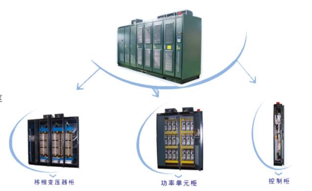 高壓變頻系統(tǒng)主要有移相變壓器柜、功率單元柜、控制柜、散熱設(shè)備構(gòu)成。變壓器柜整流變壓器為干式變壓器,H級(jí)絕緣,溫升可達(dá)155℃。