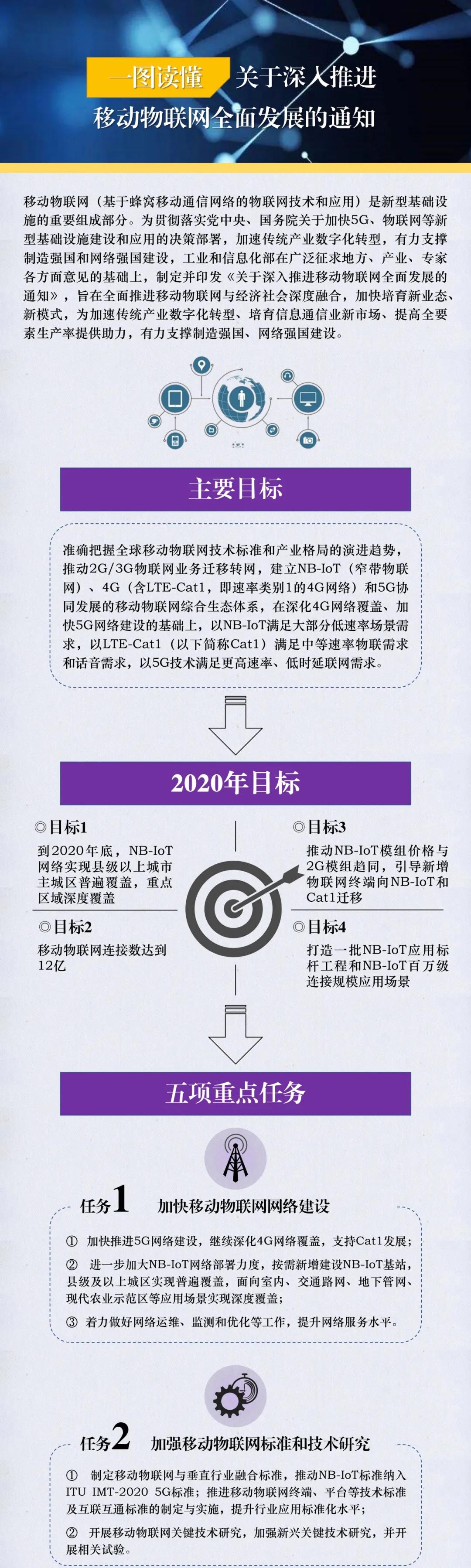 工業(yè)和信息化部近日印發(fā)《關(guān)于深入推進(jìn)移動物聯(lián)網(wǎng)全面發(fā)展的通知》,提出了什么發(fā)展目標(biāo)?將完成哪些重點(diǎn)任務(wù)、采取哪些保障措施?一圖讀懂↓↓