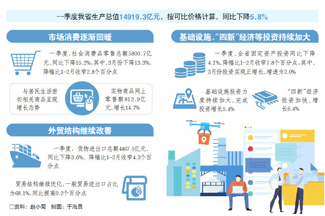 市場消費逐漸回暖,生活必需品和實物商品網上零售較快增長。一季度,社會消費品零售總額5800.7億元,同比下降15.2%。其中,3月份下降13.3%,降幅比1-2月收窄2.8個百分點;限額以上零售額下降15.8%,降幅比1-2月收窄5.1個百分點。與居民生活密切相關商品呈現增長態(tài)勢;實物商品網上零售額812.9億元,增長14.7%。
