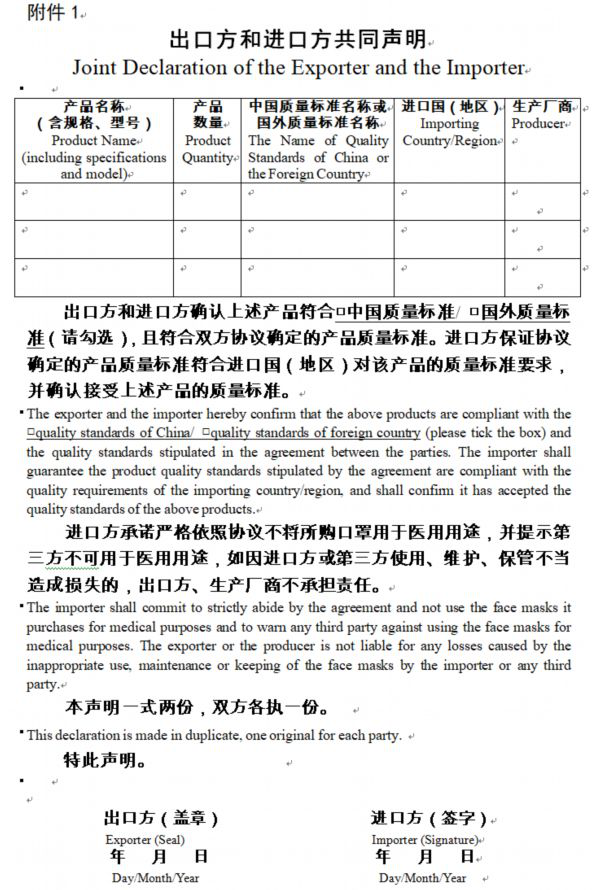 商務(wù)部確認(rèn)取得國(guó)外標(biāo)準(zhǔn)認(rèn)證或注冊(cè)的非醫(yī)用口罩生產(chǎn)企業(yè)清單(中國(guó)醫(yī)藥保健品進(jìn)出口商會(huì)網(wǎng)站www.cccmhpie.org.cn動(dòng)態(tài)更新),市場(chǎng)監(jiān)管總局提供國(guó)內(nèi)市場(chǎng)查處的非醫(yī)用口罩質(zhì)量不合格產(chǎn)品和企業(yè)清單(市場(chǎng)監(jiān)管總局網(wǎng)站www.samr.gov.cn動(dòng)態(tài)更新),非醫(yī)用口罩出口企業(yè)報(bào)關(guān)時(shí)須提交電子或書(shū)面的出口方和進(jìn)口方共同聲明(參考附件1),確認(rèn)產(chǎn)品符合中國(guó)質(zhì)量標(biāo)準(zhǔn)或國(guó)外質(zhì)量標(biāo)準(zhǔn),進(jìn)口方接受所購(gòu)產(chǎn)品質(zhì)量標(biāo)準(zhǔn)且不用于醫(yī)用用途,海關(guān)憑商務(wù)部提供的企業(yè)清單驗(yàn)放,對(duì)不在市場(chǎng)監(jiān)管總局提供的企業(yè)清單內(nèi)的,海關(guān)接受申報(bào),予以驗(yàn)放。