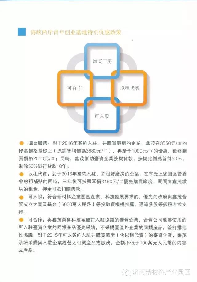 海峽兩岸(濟(jì)南)青年創(chuàng)業(yè)基地是2015年6月由山東省臺灣事務(wù)辦公室批準(zhǔn)設(shè)立,位于山東省濟(jì)南市天橋區(qū)濟(jì)南新材料產(chǎn)業(yè)園區(qū)鑫茂齊魯科技城內(nèi),規(guī)劃建筑面積30萬平方米,以鑫茂集團(tuán)二十年開發(fā)建設(shè)運營管理科技園品牌為依托,以鑫茂科技國家級孵化器為支撐,搭建高層次的兩岸青年創(chuàng)業(yè)育成平臺,推動常態(tài)化的兩岸創(chuàng)業(yè)青年交流,促成有實際示范效果的兩岸產(chǎn)學(xué)研合作。為促進(jìn)海峽兩岸(濟(jì)南)青年創(chuàng)業(yè)基地建設(shè),園區(qū)管委會專門在鑫茂齊魯科技城53號樓設(shè)立臺商會館,搭建臺商交流平臺,建立專業(yè)管理團(tuán)隊,提供臺商入園咨訊,建設(shè)臺商產(chǎn)品科研成果展示中心。海峽兩岸(濟(jì)南)青年創(chuàng)業(yè)基地不僅配套齊全,能夠為小企業(yè)創(chuàng)業(yè)提供優(yōu)良的創(chuàng)業(yè)輔導(dǎo)硬件環(huán)境,而且為入駐的臺灣企業(yè)和青年創(chuàng)業(yè)者量身打造了金融服務(wù)、創(chuàng)業(yè)融資服務(wù)、中介機(jī)構(gòu)服務(wù)、上市服務(wù)、審批服務(wù)、科技服務(wù)、科技互聯(lián)網(wǎng)、物聯(lián)網(wǎng)服務(wù)、信息化檔案管理服務(wù)、全方位工業(yè)物業(yè)管理服務(wù)等10多項服務(wù)。同時,為全力支持臺灣青年創(chuàng)業(yè)就業(yè),除享受國家、省、市給予的優(yōu)惠政策外,園區(qū)參考大陸各地區(qū)的支持政策,出臺更優(yōu)惠的扶持政策。