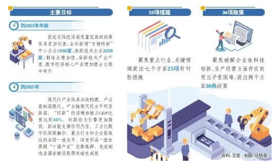 《實(shí)施意見》包括三部分內(nèi)容。第一部分總體要求,充分銜接綠色低碳高質(zhì)量發(fā)展先行區(qū)三年行動計劃、先進(jìn)制造業(yè)強(qiáng)省行動計劃等規(guī)劃方案,明確支持實(shí)體經(jīng)濟(jì)發(fā)展的指導(dǎo)思想,提出2023年和2025年的主要目標(biāo):到2023年年底,促進(jìn)實(shí)體經(jīng)濟(jì)高質(zhì)量發(fā)展的政策體系更加完善,全年新增“專精特新”中小企業(yè)1000家、高新技術(shù)企業(yè)2000家,制造業(yè)增加值、高新技術(shù)產(chǎn)業(yè)產(chǎn)值、數(shù)字經(jīng)濟(jì)核心產(chǎn)業(yè)增加值占比穩(wěn)中有升。到2025年,現(xiàn)代化產(chǎn)業(yè)體系加快構(gòu)建,產(chǎn)業(yè)基礎(chǔ)高級化、產(chǎn)業(yè)鏈現(xiàn)代化水平明顯提高,“四新”經(jīng)濟(jì)增加值占GDP比重達(dá)到40%,創(chuàng)新動力引擎更加強(qiáng)勁,新動能支撐作用凸顯,工業(yè)化數(shù)字化深度融合,重點(diǎn)行業(yè)和企業(yè)能效達(dá)到全國一流水平,培育形成一批世界級“十強(qiáng)產(chǎn)業(yè)”優(yōu)勢集群,先進(jìn)制造業(yè)強(qiáng)省建設(shè)取得突破性成效。