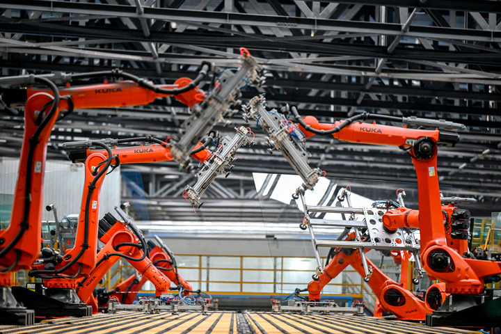 3月15日,在準(zhǔn)格爾旗一家玻璃制造企業(yè),智能機(jī)械臂在流水線上作業(yè)。(新華社)
