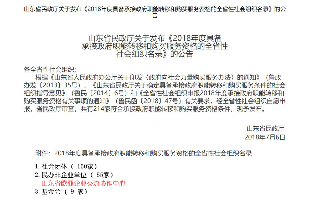 省委書記劉家義同志近期在“山東省招商引資招才引智工作會議”上指出,要不斷創(chuàng)新招商引資、招才引智。其方式之一就是:委托代理招,發(fā)揮國際、國內有影響的行業(yè)組織機構代理招商的獨特作用。山東省歐亞企業(yè)交流協作中心(以下簡稱“歐亞中心”)作為重要的行業(yè)組織, 剛剛被山東省民政廳批準獲得“2018年承接政府職能轉移和購買服務”的資格,在此,表示衷心祝賀。