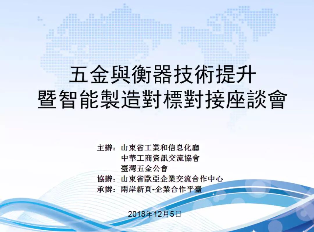 12月5日下午,由山東省工信廳、山東省五金與衡器行業(yè)協(xié)會(huì)、臺(tái)灣五金公會(huì)、中華工商咨詢交流協(xié)會(huì)主辦,山東省歐亞企業(yè)交流協(xié)作中心(以下簡(jiǎn)稱“歐亞中心”)協(xié)辦,兩岸新頁(yè)企業(yè)合作平臺(tái)承辦的“五金與衡器技術(shù)提升暨智能制造對(duì)標(biāo)對(duì)接座談會(huì)“在臺(tái)灣成功舉辦,魯臺(tái)雙方共計(jì)60余人參加會(huì)議。