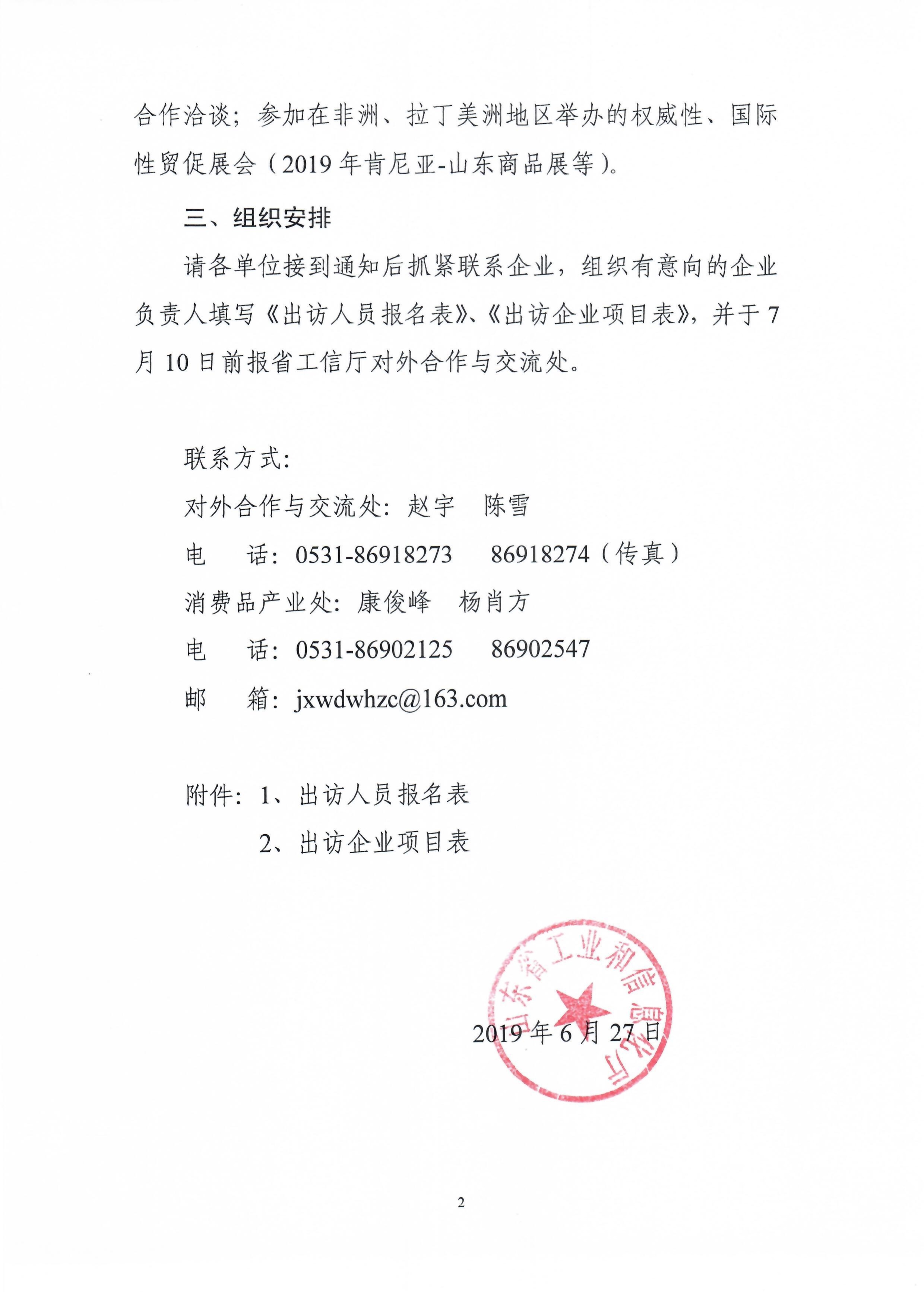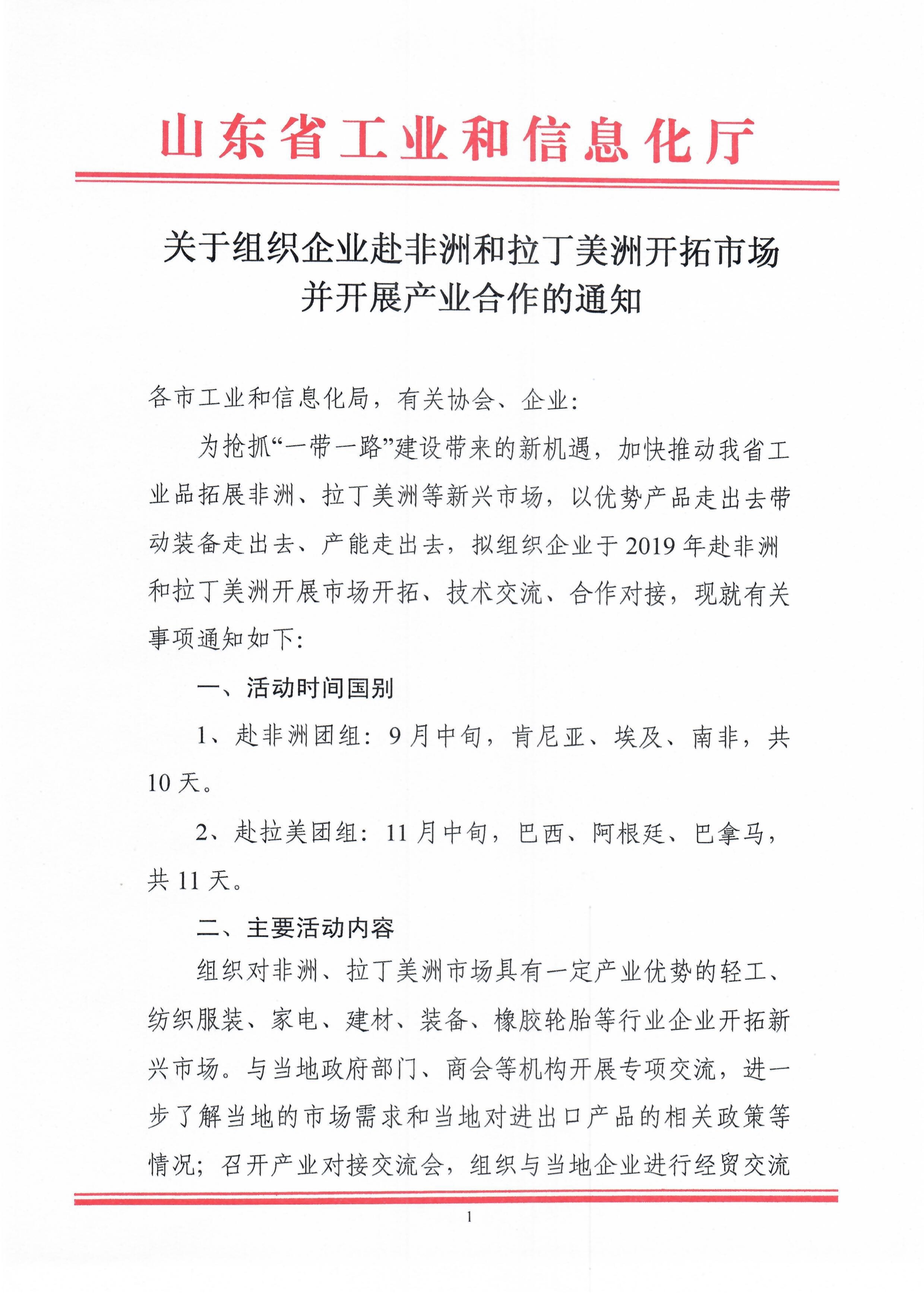 為搶抓“一帶一路”建設帶來的新機遇,加開推動我省工業(yè)品拓展非洲、拉丁美洲等新興市場,以優(yōu)勢產品走出去帶動裝備走出去、產能走出去,省工信廳擬組織我省企業(yè)于2019年赴非洲和拉丁美洲開展市場開拓、技術交流、合作對接。機不可失,時不再來,有意向企業(yè)請抓緊報名。