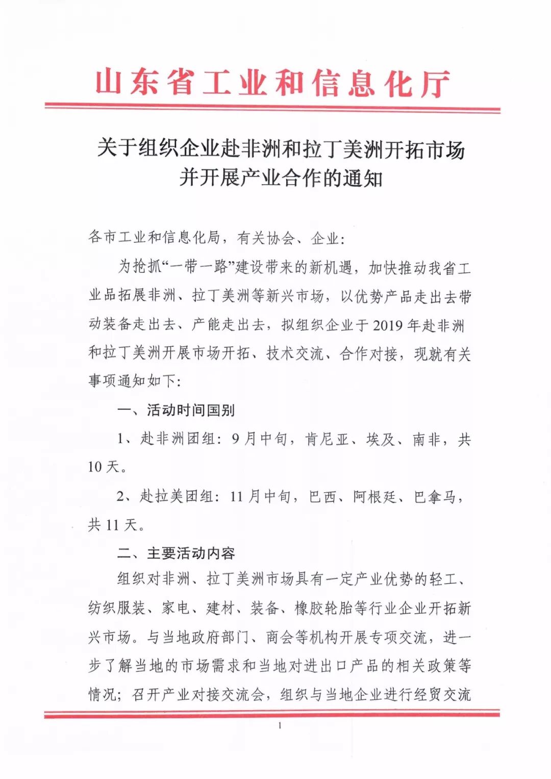 為搶抓“一帶一路”建設(shè)帶來的新機(jī)遇,加快推動(dòng)我省工業(yè)品拓展拉丁美洲市場(chǎng),以優(yōu)勢(shì)產(chǎn)品走出去帶動(dòng)裝備走出去、產(chǎn)能走出去,在拉美地區(qū)尋找優(yōu)秀的合作伙伴,推動(dòng)我省中小企業(yè)產(chǎn)品進(jìn)入拉美市場(chǎng)。省工信廳擬組織我省企業(yè)于2019年赴拉丁美洲開展市場(chǎng)開拓、技術(shù)交流、合作對(duì)接。