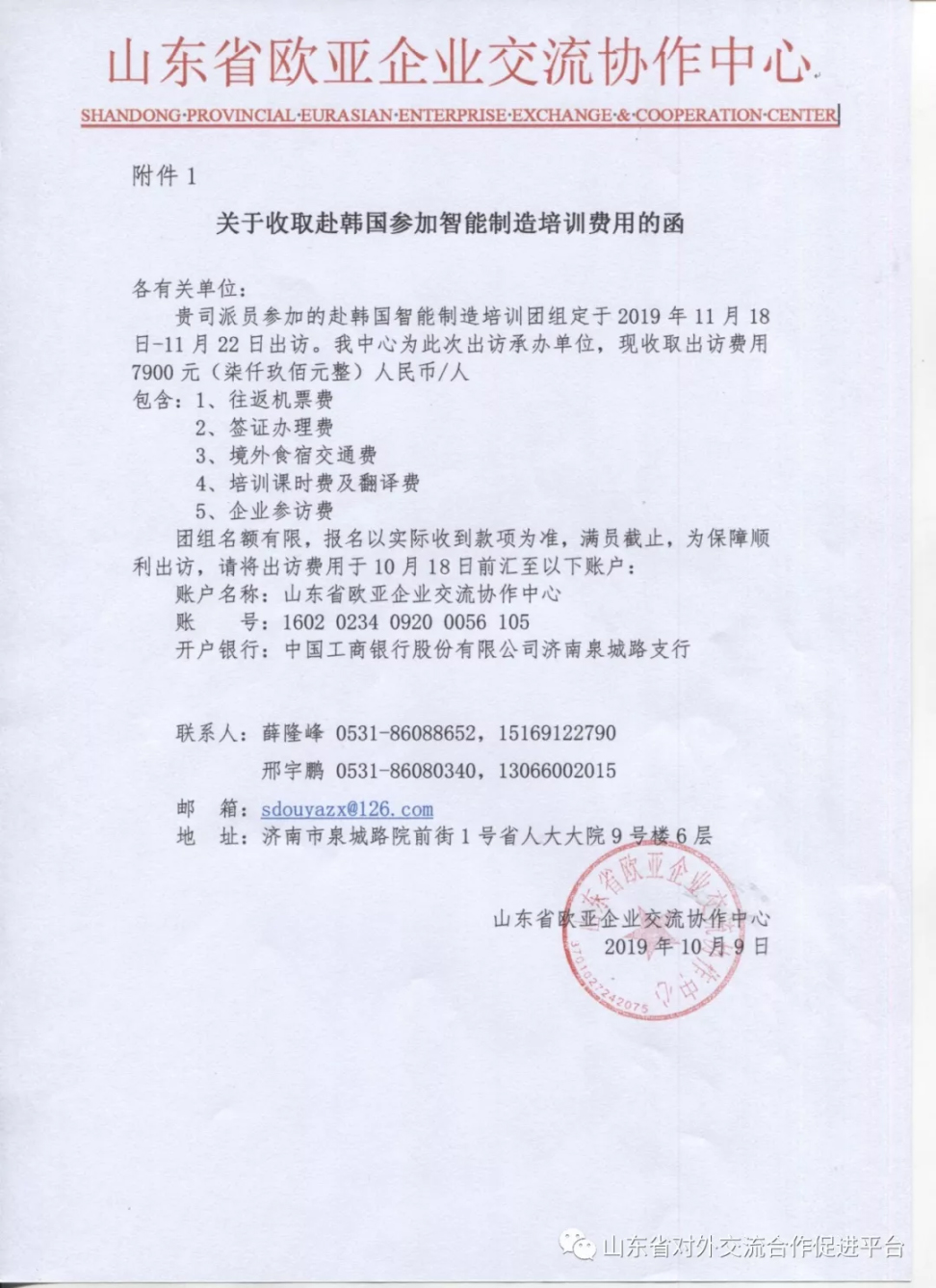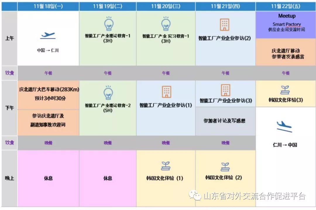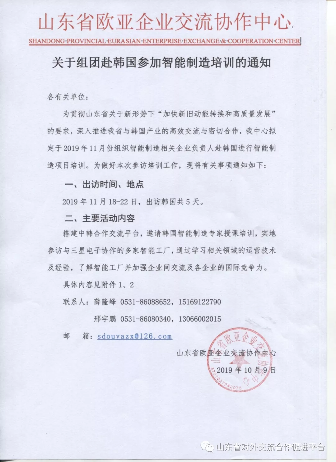 為貫徹山東省關于新形勢下“加快新舊動能轉(zhuǎn)換和高質(zhì)量發(fā)展”的要求。深入推進我省與韓國產(chǎn)業(yè)的高效交流與密切合作。山東省歐亞企業(yè)交流協(xié)作中心擬定于2019年11月份組織智能制造相關企業(yè)負責人赴韓國進行智能制造培訓項目。機不可失,時不再來,有意向企業(yè)請抓緊報名。